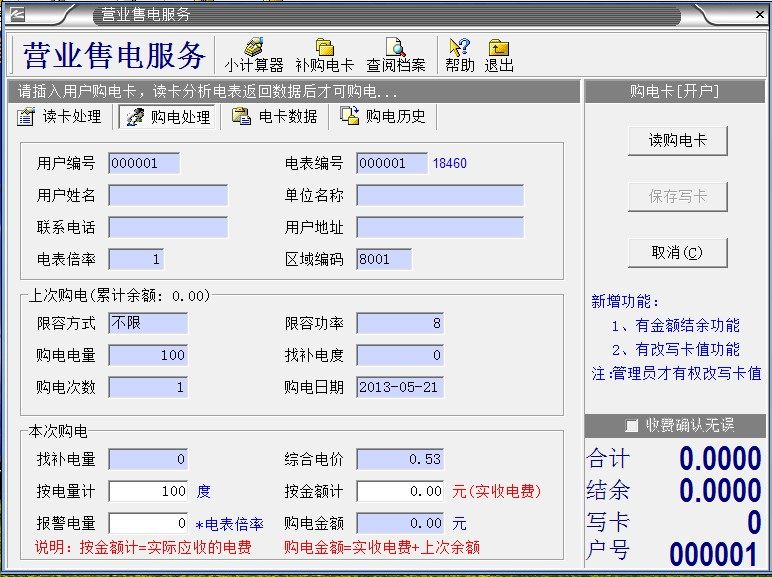 3、電表第一次使用,電表里有20度預置電量,是不能用完,要馬上給用戶開戶,插IC卡使用,第二次是沒關系的,用完了再沖也是可以的。